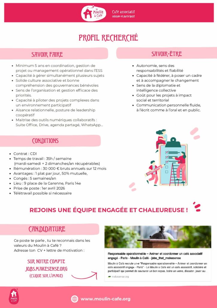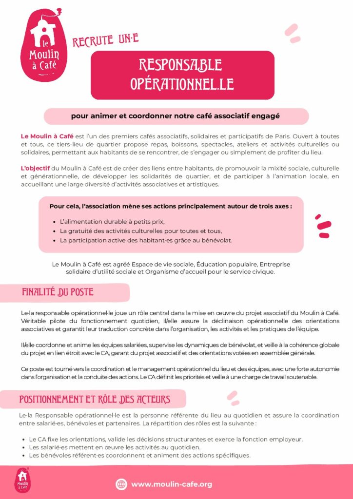 Créé en 2006 dans le quartier Pernety (14ème arrondissement), le Moulin à Café est un café associatif, solidaire et participatif, géré sous forme associative avec 9 salariés, 100 habitants bénévoles et 20 associations partenaires. Il est l’un des premiers cafés associatifs, solidaires et participatifs de Paris.